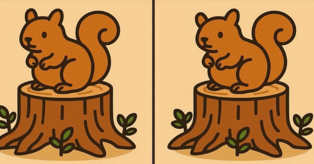 In the image above, we see two seemingly identical illustrations of a cheerful squirrel sitting in a lush forest clearing. But don’t let the cute artwork fool you—there are three subtle differences hidden between the two frames. Do you have what it takes to find them all before the clock runs out?